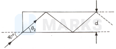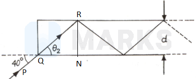 Let and be the refractive indices of the air and optical fibre respectively. Applying Snell's law at Q, we get:
