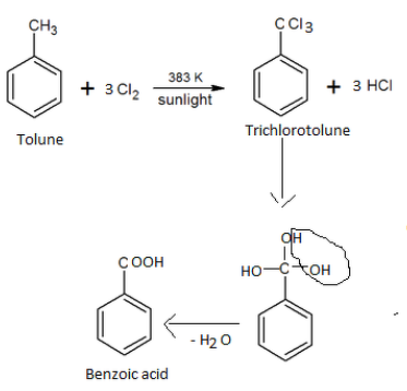 In presence of light & heat toluene chlorinated & react with aqueous $\mathrm{NaOH}$ to give