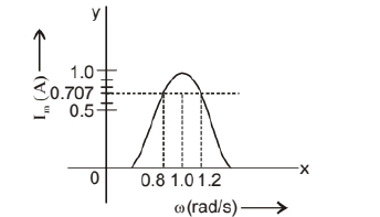 Let $\omega_1$ and $\omega_2$ are two frequencies at which magnitude of current is $\frac{1}{\sqrt{2}}$ times of maximum value for LCR circuit. i.e., $\quad \mathrm{I}_{\mathrm{ms}}=\frac{\mathrm{I}_{\max }}{\sqrt{2}}=\frac{1}{\sqrt{2}} \approx 0.7 \mathrm{Amp}$