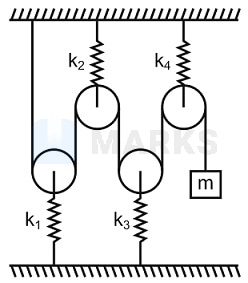 In the arrangement shown in the diagram, pulleys are small and springs are ideal. are force constants of the springs and mass . If the time period of small vertical oscillations of the block of mass is given by , then find the value of .