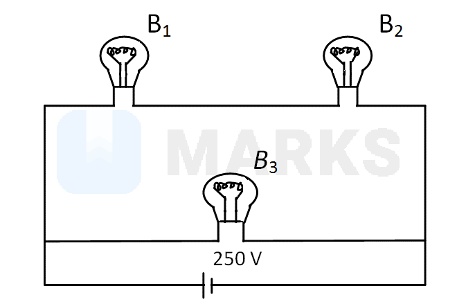 In the circuit given below, a bulb and two bulbs and , are connected to a direct current source. If , and are the powers of the three bulbs then, which of the following statements is corect?