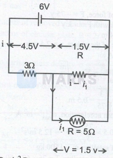 $\begin{aligned} & -6+3 \mathrm{i} 1.5=0 \\ & \mathrm{i}=\frac{6-1.5}{3}=1.5 \mathrm{~A} \\ & 1.5=\left(\mathrm{i}-\mathrm{i}_1\right) \mathrm{R} \\ & 1.5=(1.5-0.3) \mathrm{R} \\ & \mathrm{R}=\frac{1.5}{1.2}=1.25 \Omega\end{aligned}$