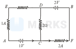 In the circuit, given in the figure currents in different branches and value of one resistor are shown. Then potential at point with respect to the point is:
