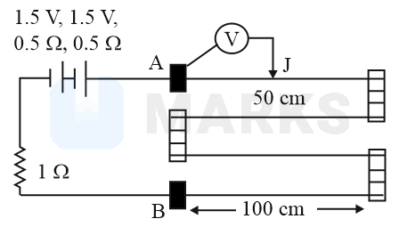 In the circuit shown, a four-wire potentiometer is made of a long wire, which extends between and . The resistance per unit length of the potentiometer wire is If an ideal voltmeter is connected as shown with jockey at from end , the expected reading of the voltmeter will be: