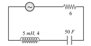 $\begin{aligned} & R=6+4=10 \Omega \\ & X_L=\omega L=2000 \times 5 \times 10^{-3}=10 \Omega \\ & X_C=\frac{1}{\omega C}=\frac{1}{2000 \times 50 \times 10^{-6}}=10 \Omega \\ & \therefore Z=\sqrt{R^2+\left(X_L-X_C\right)^2}=10 \Omega \\ & \text { Amplitude of current }=i_0=\frac{V_0}{Z}=\frac{20}{10}=2 \mathrm{~A}\end{aligned}$