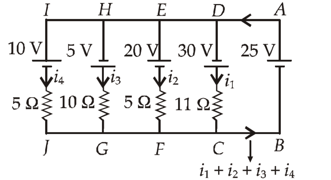 Solving equations (i), (ii), (iii) and (iv) we get $i_1=5 \mathrm{~A}, i_2=1 \mathrm{~A}, i_3=3 \mathrm{~A}$ and $i_4=3 \mathrm{~A}$.