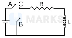 In the circuit shown here, the point '' is kept connected to point '' till the current flowing through the circuit becomes constant. Afterward, suddenly, point '' is disconnected from point '' and connected to point '' at time . Ratio of the voltage across resistance and the inductor at will be equal to :