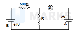 In the circuit, the galvanometer $G$ shows zero deflection. If the batteries $A$ and $B$ have negligible internal resistance, the value of the resistor $\mathrm{R}$ will be