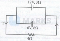$\begin{aligned} & \mathrm{Eq}=\mathrm{E}_1+\mathrm{E}_2 \\ & =12+6=18 \mathrm{~V} \\ & \mathrm{req}=\mathrm{r}_1+\mathrm{r}_2 \\ & =6+3 \\ & =9 \Omega\end{aligned}$