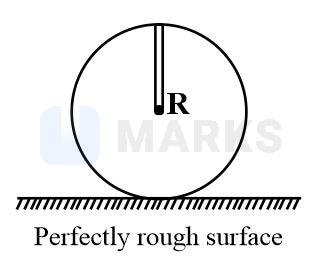 In the diagram shown, a rod of mass has been fixed on a ring of the same mass. The whole system has been placed on a perfectly rough surface. The system is gently displaced so that the ring starts rolling. The velocity of the centre of the ring when the rod becomes horizontal is (the length of the rod is equal to the radius of the ring)