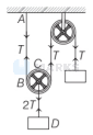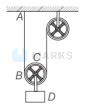 In the diagram shown below, both the strings $A B$ and $C D$ are made of same material and have same cross-section. The pulleys are light and fictionless. If the speed of wave in string $A B$ is $v_1$ and in $C D$ is $v_2$, then $\frac{v_1}{v_2}$ is