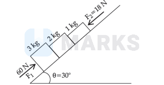 In the diagram shown, the normal reaction force between $2 \mathrm{~kg}$ and $1 \mathrm{~kg}$ is (Given $g=10 \mathrm{~ms}^{-2}$) (Consider the surface, to be smooth):