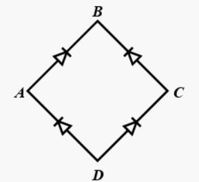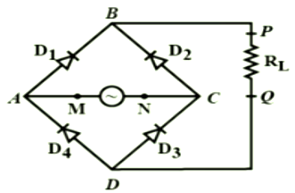 During half cycle when $\mathrm{V}_{\mathrm{M}} \gt \mathrm{V}_{\mathrm{N}}, \mathrm{D}_1$ andD $\mathrm{D}_3$ are forward biased. The path of current is MABPQDCNM. In second half cycle, $V_N\gtV_M, D_2$ and $D_4$ are forward biased while $D_1$ and $D_3$ are reverse biased. Hence, path of current is, NCBPQDAMN.
