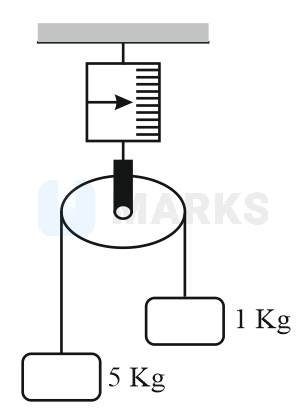 In the figure, a smooth pulley of negligible weight is suspended by a spring balance. Masses of and are attached to the opposite ends of a string passing over the pulley and move with some acceleration. During their motion, the spring balance reads a weight of