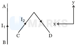 In the figure shown a current I1 is established in the long straight wire AB. Another wire CD carrying current I2 is placed in the plane of the paper. The line joining the ends of the wire is perpendicular to the wire AB. The resultant force on the wire CD is :