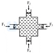 In the figure shown water is filled in a symmetrical container. Four pistons of equal area are used at the four openings to keep the water in equilibrium. Now an additional force is applied at each piston. The increase in the pressure at the centre of the container due to this addition is