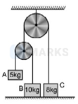 In the following arrangement, the system is initially at rest. The block is now released. Assuming the pulleys and string to be massless and smooth. If the acceleration of block is , then find the value of . Take .