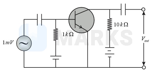 In the following common emitter configuration, an transistor with current gain is used. The output voltage of the amplifier will be