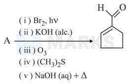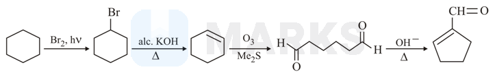 The above reaction sequence is given below. In the first step, halogenation reaction is occurred then elimination reaction gives cyclohexene and reductive ozonolysis gives the dialdehyde and then aldol condensation takes place and final desired product is formed.