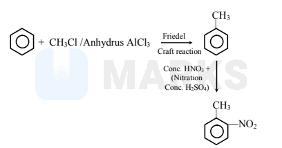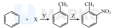 $\mathrm{X}=\mathrm{CH}_{3} \mathrm{Cl} ; \mathrm{Y}=$ anhydrous $\mathrm{AlCl}_{3} ; \mathrm{Z}=\mathrm{HNO}_{3}+\mathrm{H}_{2} \mathrm{SO}_{4}$