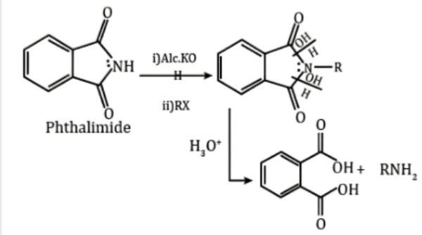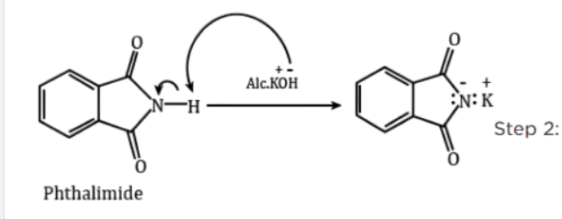 Step 1: When potassium hydroxide is introduced to the phthalimide, an acidbase reaction occur. The hydroxide ion deprotonates the imide. The resulting proton is more acidic than any simple amine, generating a strong nucleophile the potassium phthalimide ion.