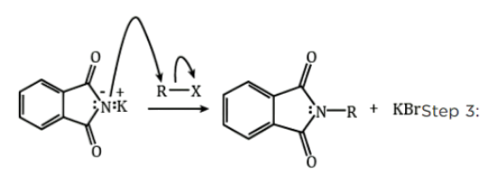 The nucleophilic potassium imide ion attacks the electrophilic carbon of the alkyl halide. The nitrogen atom subsequently replaces the halogen (Fluorine, Chlorine, Bromine or lodine) in the alkyl halide and bonds with the carbon itself. This results in the formation of an N-Alkyl Phthalimide.