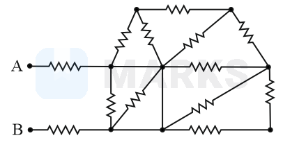 In the given circuit all resistance is of the value of ohm each. The equivalent resistance between and is: