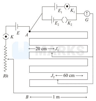 In the given circuit of potentiometer, the potential difference across ( length) is larger than and as well. For key (closed), the jockey is adjusted to touch the wire at point so that there is no deflection in the galvanometer. Now the first battery is replaced by second battery for working by making open and closed. The galvanometer gives then null deflection at . The value of is where _______ .