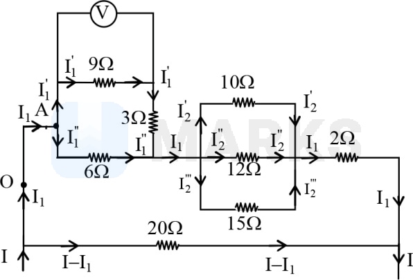 The same current passes through . The resistors and are in series and their equivalent, i.e., is in parallel with between and . Dividing the current in the inverse ratio of resistances between and ,