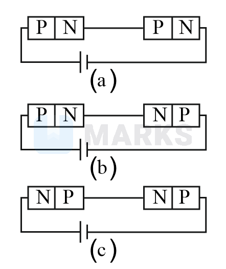 In circuit(c), both p-n junctions are in reverse bias and hence negligible current will flow through the circuit and potential drop will be equal.
