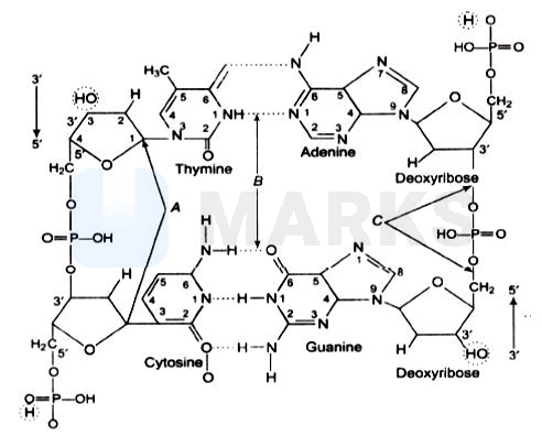 DNA is the nucleic acid that forms the genetic material in all organisms. The structure of deoxyribose nucleic acid was elucidated by Watson and Crick. The DNA is a double helical structure having two anti-parallel strands of polynucleotide chains joined to each other by hydrogen bonding [B] formed between the N-bases. The backbone of the structure is constituted by the sugar-phosphate linked by the phosphodiester bond[C]. N-bases from double and triple H-bonds where Adenine always binds to Thymine (2 bonds) and Guanine binds to Cytosine (3 bonds). The N-bases are joined to the sugar structure by forming N-glycosidic bond[A] .