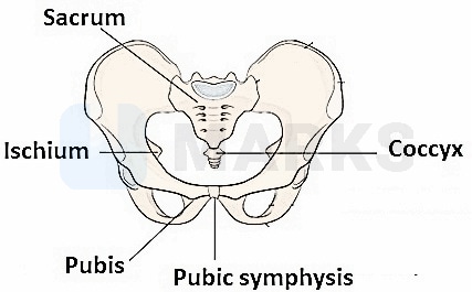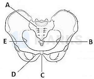 A- Sacrum; B- Coccyx; C- Pubic symphysis; D- Pubis; E- Ischium