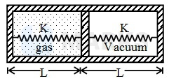 In the given figure the area of the frictionless and movable piston is and it is being held in equilibrium by an external force. Now the external force is slowly removed due to that the piston displaces by where . The natural length of the ideal springs is . Spring constant is given as . The pressure of the gas in the final situation is