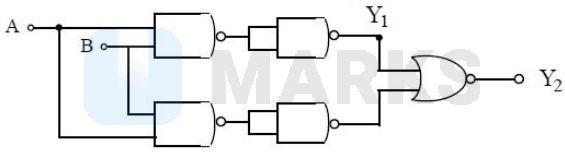 In the given logic circuit $A=1$ and $B=0$. The values of $Y_1$ and $Y_2$ are respectively.