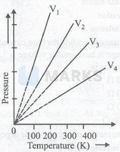 In the given pressure $(\mathrm{P})$ - absolute temperature $(\mathrm{T})$ graph of an ideal gas, the relation between volumes $V_1, V_2, V_3$ and $\mathrm{V}_4$ is