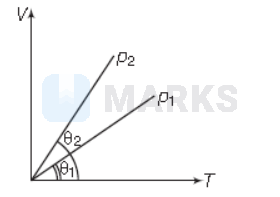 In the given ( $V-T)$ diagram, what is the relation between pressures $p_1$ and $p_2$ ?