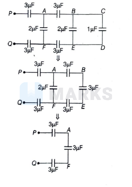 & \frac{1}{C_{\text {eq }}}=\frac{1}{3}+\frac{1}{3}+\frac{1}{3}=1 \mu \mathrm{F} \\