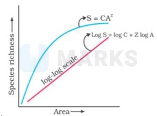 Biodiversity includes all the flora and fauna on Earth. All the varieties of organisms come under biodiversity. German naturalist Alexander von Humboldt made the observation regarding the relationship between species richness and the area of the habitat. As per his observation, species richness increased with increasing area of habitat upto a limit. When plotted in a graph with area on x-axis and species richness on y-axis, this relationship forms a rectangular hyperbola. On a log scale, the relationship is a straight line having the equation . S=species richness, A=area of region, C=Y-intercept and Z= regression co-efficient (Slope).