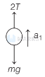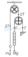 $\begin{gathered}2 M a_2+\frac{m a_2}{2}=2 M g-m g \\ \Rightarrow \quad a_2=\frac{(2 M-m)}{\left(2 M+\frac{m}{2}\right)} g=\frac{\left(2-\frac{m}{M}\right)}{\left(2+\frac{m}{2 M}\right)} g\end{gathered}$