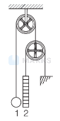 In the pulley system, the mass of ball is 1.2 times greater than the mass of the rod. The length of the rod is $50 \mathrm{~cm}$. The ball is set on the same level as the lower end of the rod and then released. What is the acceleration of the rod with which it comes down? Assume the pulleys and threads are massless and friction force is neglected. (Use, $g=10 \mathrm{~m} / \mathrm{s}^2$ )