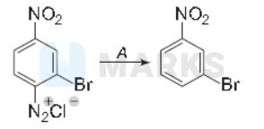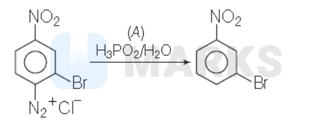 When diazonium salt is treated with $\mathrm{H}_3 \mathrm{PO}_2$ followed by hydrolysis, it diazonium group is replaced by $-\mathrm{H}$ resulting to the formation of hydrocarbon. Thus, $A$ must be $\mathrm{H}_3 \mathrm{PO}_2 / \mathrm{H}_2 \mathrm{O}$.