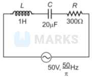 $\begin{aligned} X_{L} &=2 \pi f L \\ &=2 \pi\left(\frac{50}{\pi}\right) \times 1=100 \Omega \\ X_{C} &=\frac{1}{2 \pi f C}=\frac{1}{2 \pi\left(\frac{50}{\pi}\right) 20 \times 10^{-6}}=500 \Omega \\ \text { Impedance, } Z &=\sqrt{R^{2}+\left(X_{C}-X_{L}\right)^{2}} \\ Z &=\sqrt{(300)^{2}-(400)^{2}}=500 \Omega \end{aligned}$