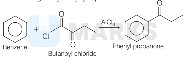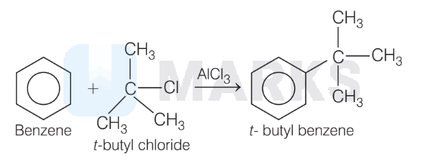 1. The replacement of H-atom in benzene, by alkyl group can be brought about alkyl chloride in presence of anhydrous $\mathrm{AlCl}_3$. Reaction is known as Friedel-Craft's alkylation reaction.
