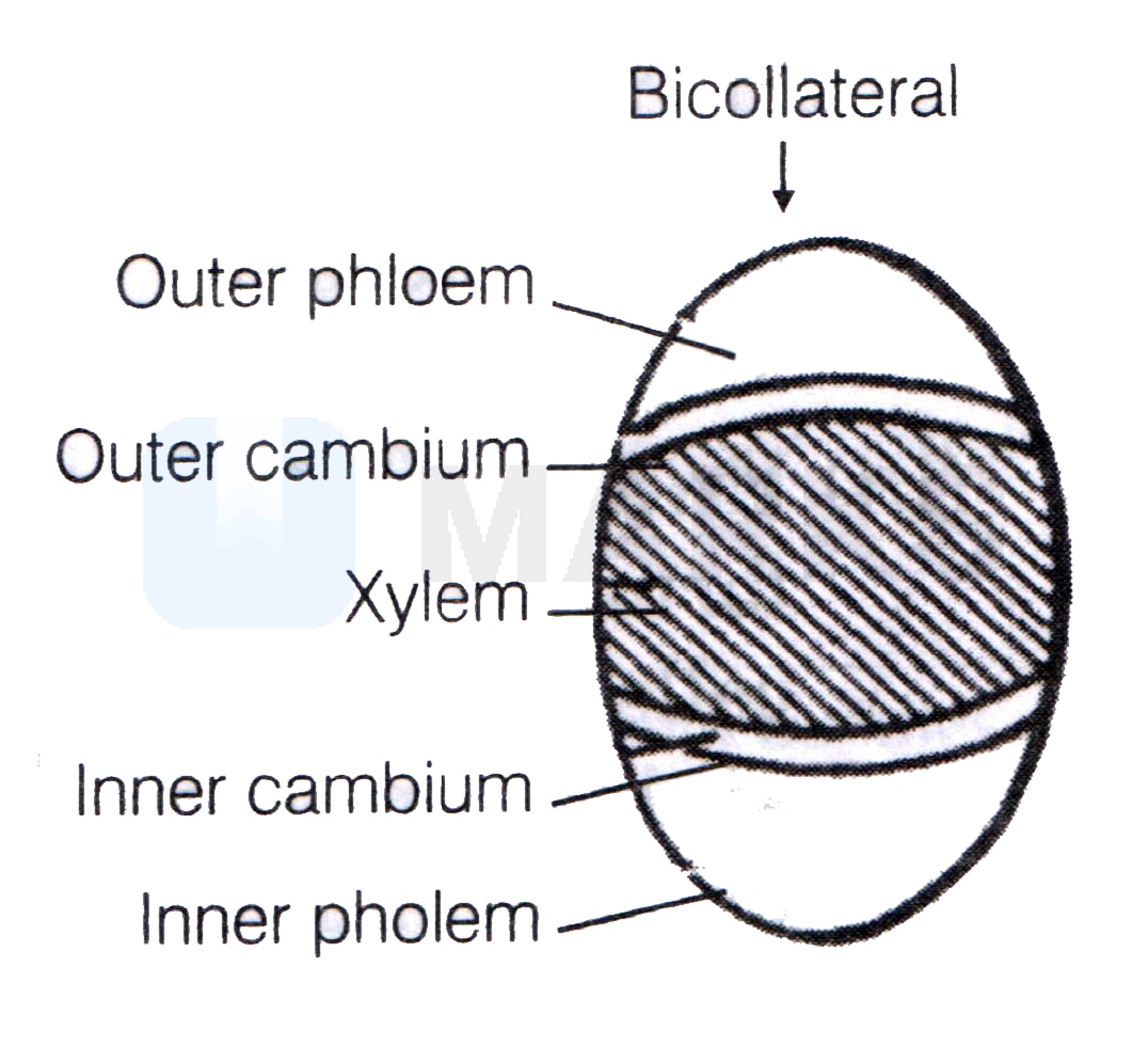 A vascular bundle is a long continuous strand of conductive tissues that extend from the roots through the stem and into the leaves. It consists of xylem and phloem that may differ in their arrangement. A vascular bundle having the phloem and cambium strands on both the outer and inner sides of xylem are called bicollateral. The arrangement is in a sequence of outer phloem, outer cambium, xylem, inner cambium, and inner phloem, for example, Cucurbita.