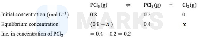 Initially, 0.8 mol of and 0.2 mol of are mixed in a one litre vessel. At equilibrium, 0.4 mol of is present. The value of for the reaction, would be