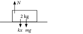 $\begin{aligned} & \frac{1}{2} k x^2=m g x, \text { where } m=2 \mathrm{~kg} \\ & k x=2 m g=2 \times 0.25 \times 10=5 \mathrm{~N} \\ & N=k x+2 \times 10=5+20=25 \mathrm{~N}\end{aligned}$