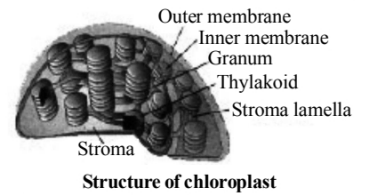 The space present inside inner membrane is called stroma. A number rof organised flattened membranous sacs called thylakoids are present in the stroma. Thylakoids are arranged in stacks called grana.