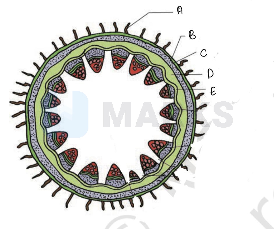 A, B, C, D, E respectively are Epidermal hair, Epidermis, Hypodermis, Parenchyma, Endodermis.