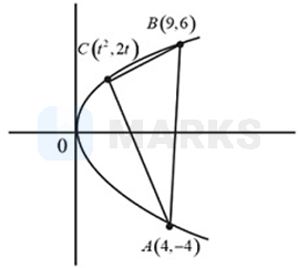 Let and be points on the parabola, Let be chosen on the arc of the parabola, where is the origin, such that the area of is maximum. Then, the area (in sq. units) of , is: