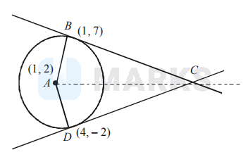 Here, centre is $A(1,2)$, and Tangent at $B$ $(1,7)$ is